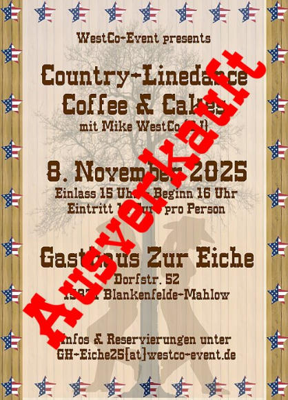 Und weiter geht es mit Country-LD im GH Zur Eiche.Einlass 15 Uhr --- Beginn 16 Uhr --- Eintritt 12 Euro pro PersonWir starten mit Kaffee und Kuchen oder ähnlichem …A U S V E R K A U F TInfos unter GH-Eiche25@westco-event.deAblauf Vorkasse:Nach Erhalt der Reservierung wird die Bankverbindung mitgeteilt.Nach Zahlungseingang gibt es die Bestätigung der Reservierung.Sollte wegen neuer Beschränkungen durch amtliche Stellen die Veranstaltung abgesagt werden müssen, werden die bereits gezahlten Beträge erstattet.Wir freuen uns schon jetzt auf euch.